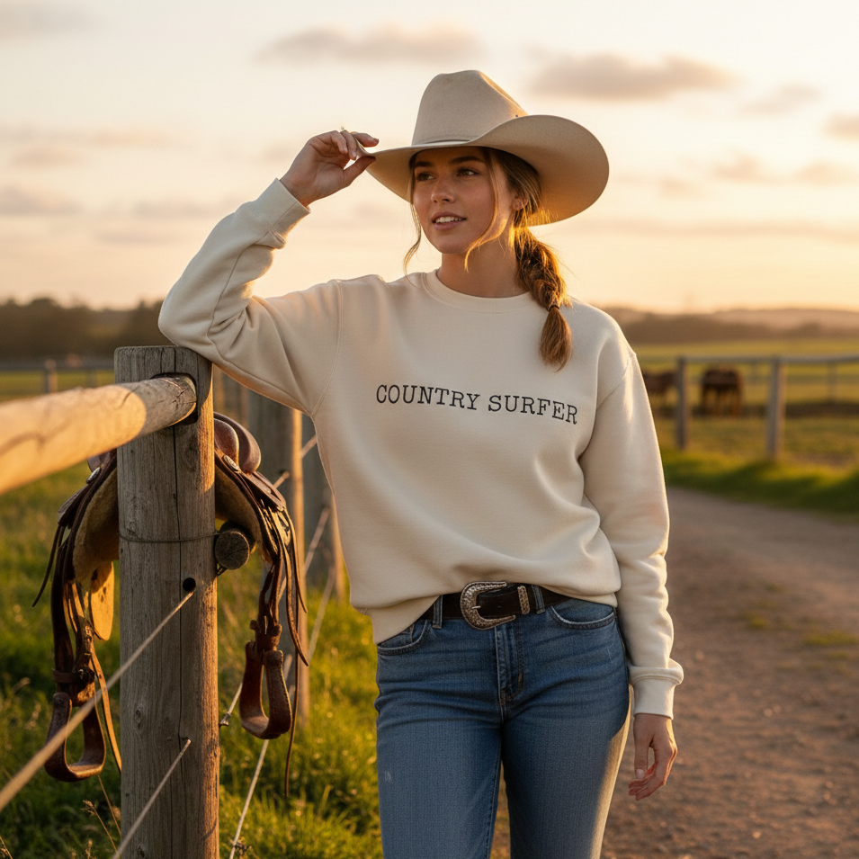 A soft, neutral-toned crewneck sweatshirt, mid-weight 50/50 cotton-poly blend drapes casually while ribbed collar and cuffs keep the shape. A go-to layer for slow mornings, bonfire evenings, or weekend drives down back roads. It feels familiar from the first wear and stands up to repeated washes thanks to reinforced stitching and quality construction. Wear it with jeans, a trucker hat, and boots for an easy lived-in look that nods to both country roots and surf-day freedom.
